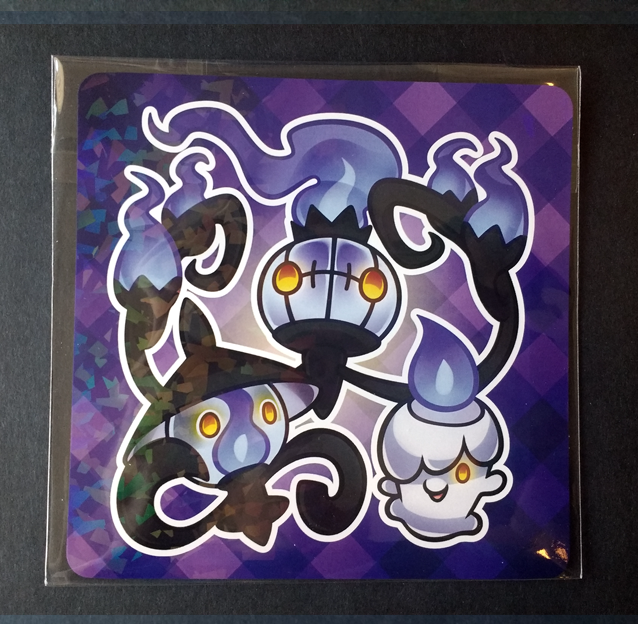 A holographic print featuring the ghost Pokémon from Unova, Litwick, Lampent, & Chandelure!