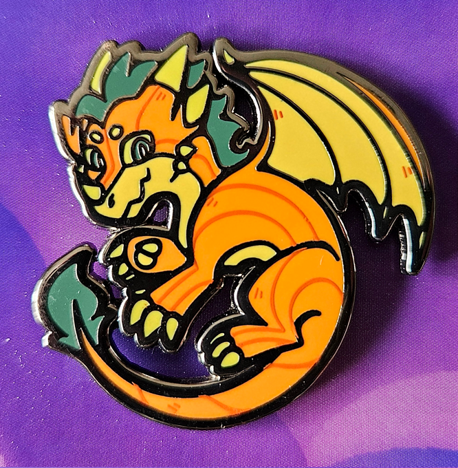 A 1.5 inch enamel pin featuring Patch the Pumpkin Dragon!
