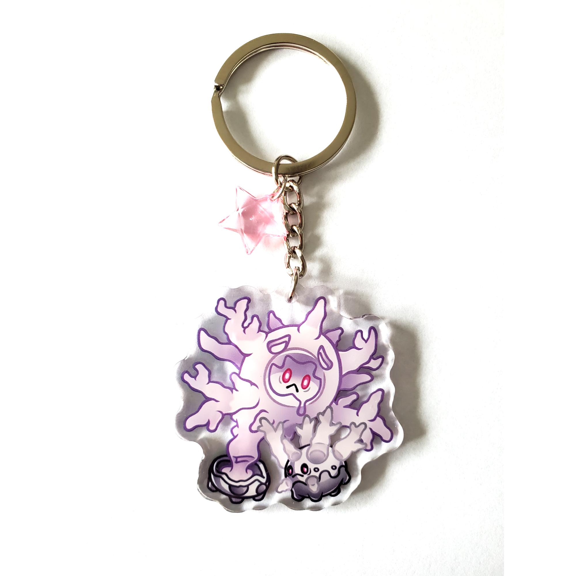 A 2 inch clear epoxy-coated acrylic keychain featuring the Ghost Pokémon from Galar, Galarian Corsola & Cursola!