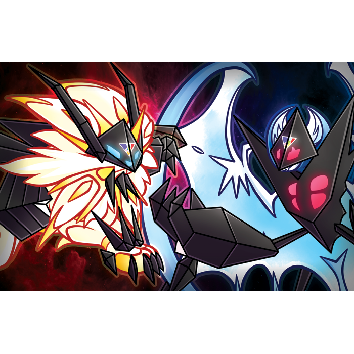 A holographic print featuring the mysterious forms of the legendary Pokémon from Alola, Dusk Mane Necrozma and Dawn Wings Necrozma!