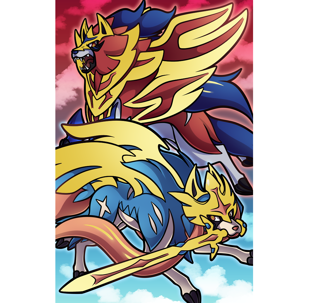 A print featuring the Legendary Pokemon from Sword and shield, Zacian & Zamazenta, with a reflective gold foil finish!