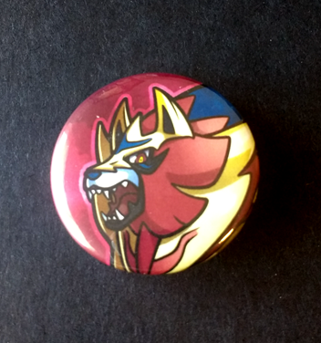 A pin-back button featuring the Shield Legendary from Galar, Zamazenta!