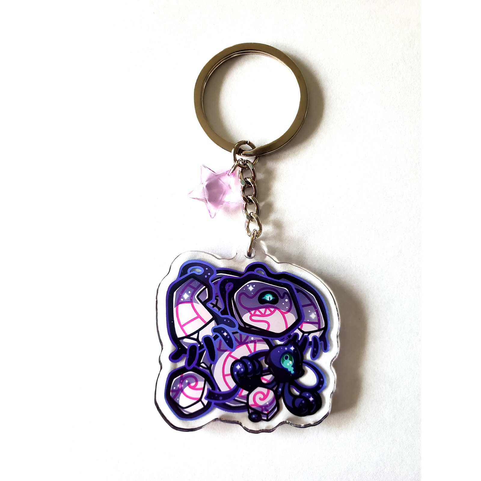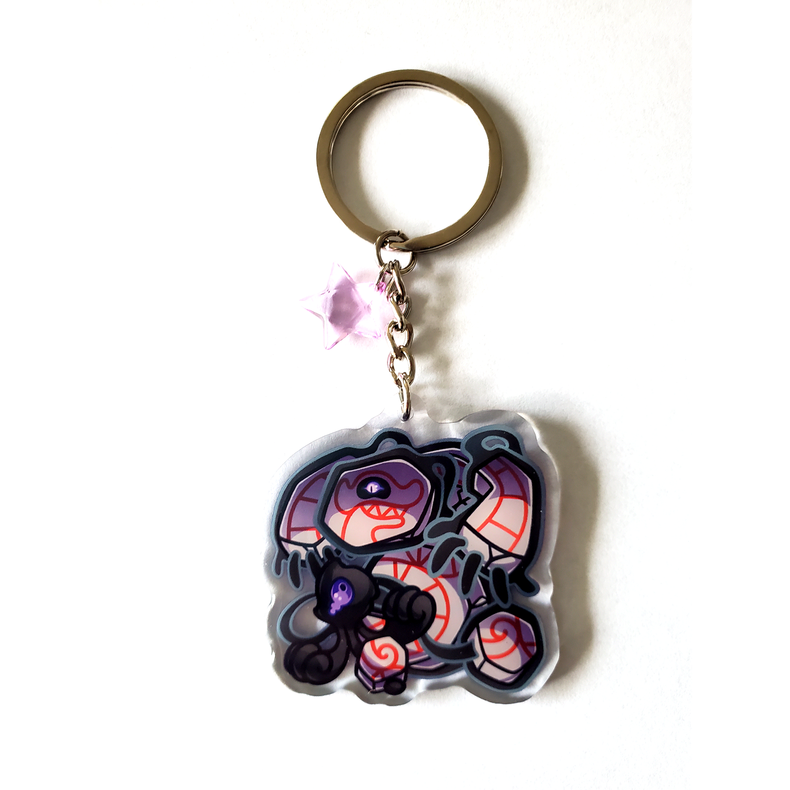 A 2 inch clear epoxy-coated acrylic keychain featuring the Ghost Pokémon from Galar, Galarian Yamask & Runerigus!