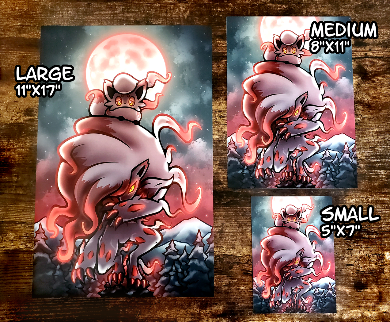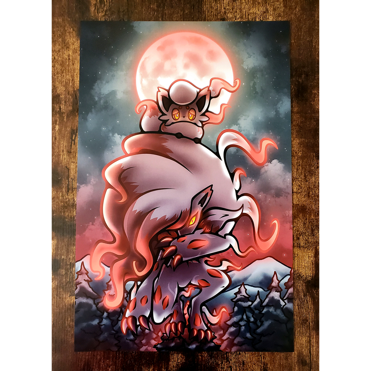 A print featuring the ghost types Hisuian Zorua & Zoroark from Pokémon Legends: Arceus, silhouetted by a full moon.