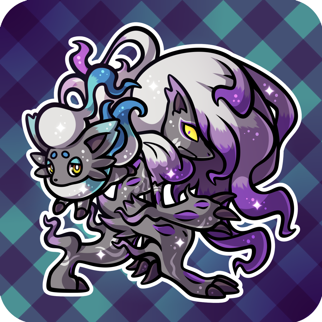 A holographic print featuring the shiny forms of the ghost Pokémon from Hisui, Hisuian Zorua & Zoroark!