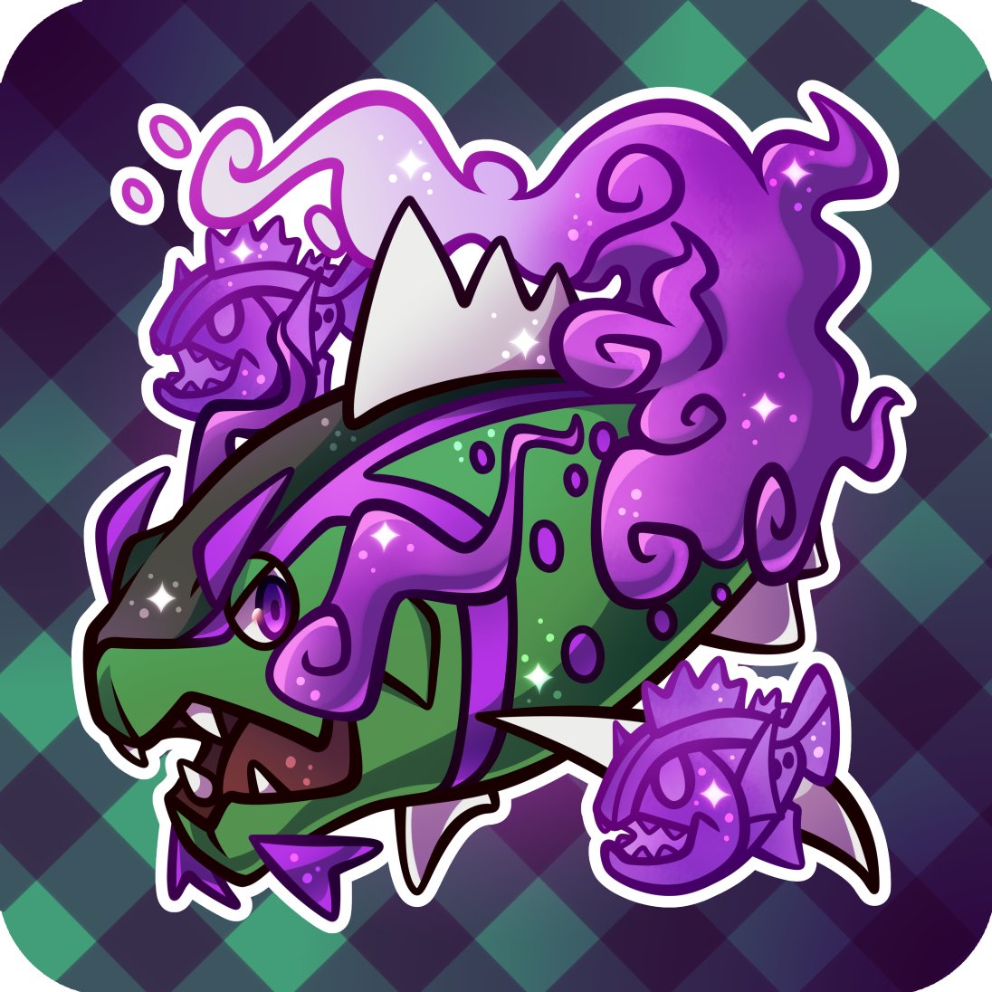 A holographic print featuring the shiny form of the ghost/water Pokémon from Hisui, Basculegion!