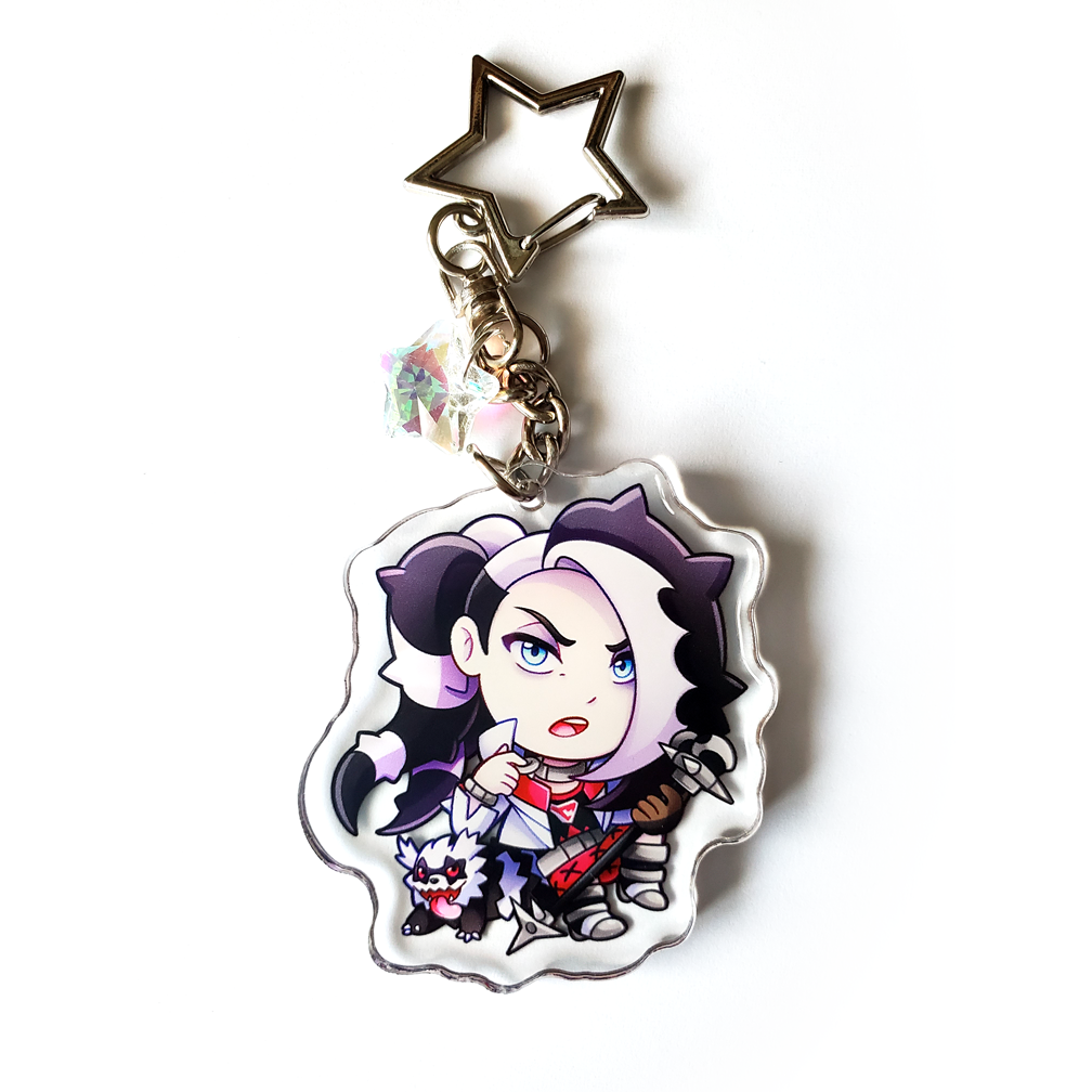 A 2 inch clear epoxy-coated acrylic keychain featuring the Pokémon trainer Piers & his partner, Galarian Zigzagoon!