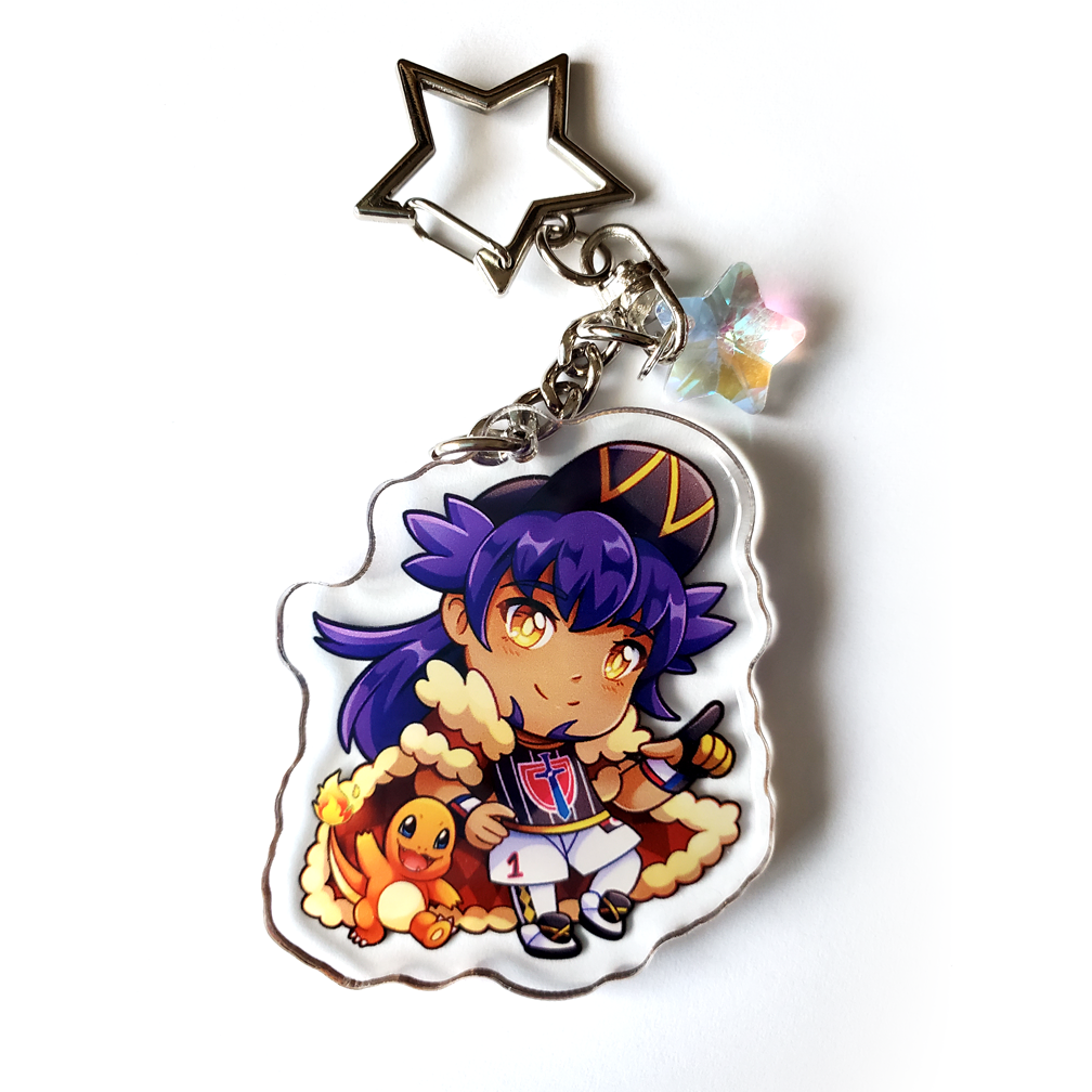 A 2 inch clear epoxy-coated acrylic keychain featuring the Pokémon trainer Leon & his partner, Charmander!