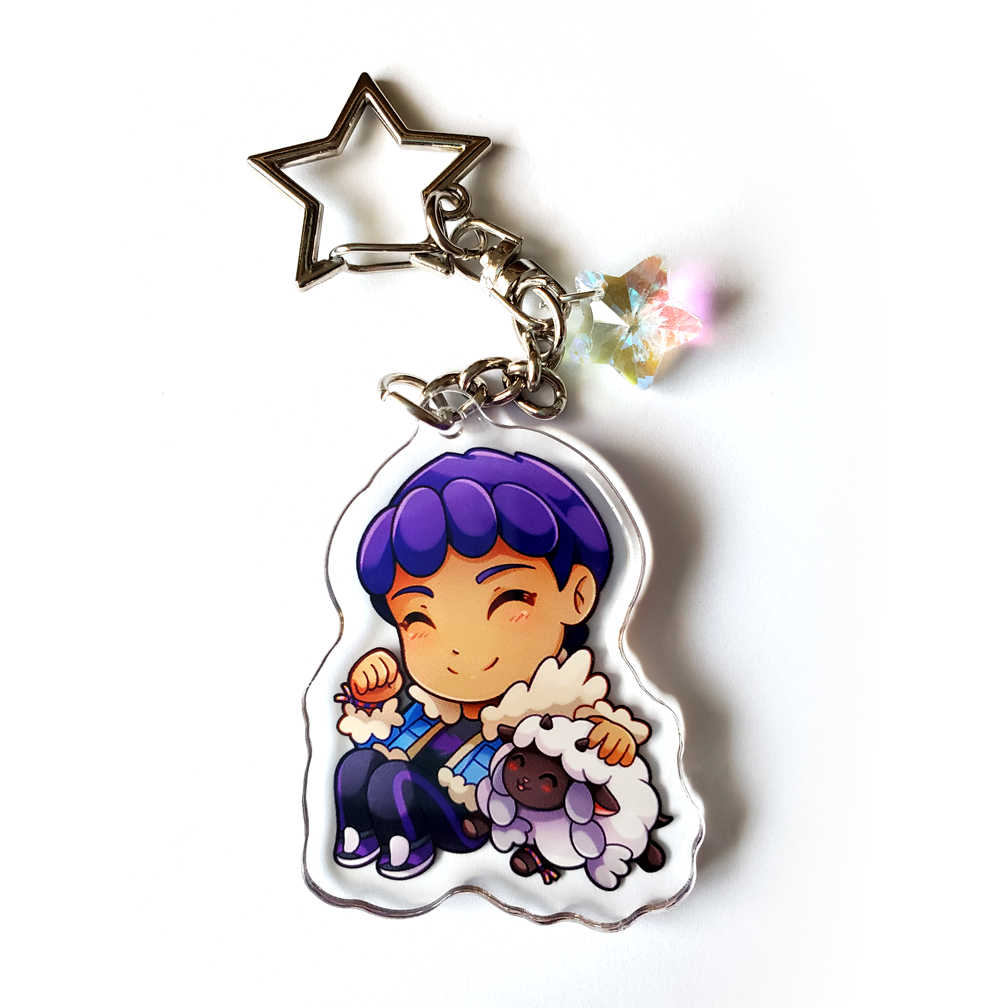 A 2 inch clear epoxy-coated acrylic keychain featuring the Pokémon trainer Hop & his partner, Wooloo!