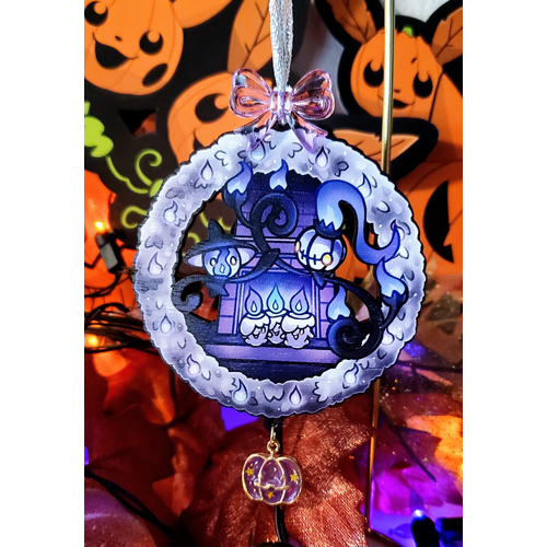 A 3-inch wooden ornament featuring the ghost Pokémon Litwick, Lampent, & Chandelure around a cozy fireplace!