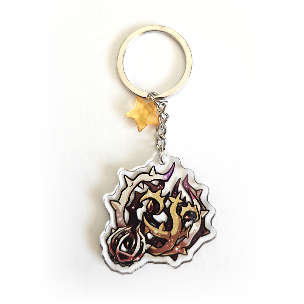 A 2 inch clear epoxy-coated acrylic keychain featuring the Ghost Pokémon from Paldea, Bramblin & Brambleghast!