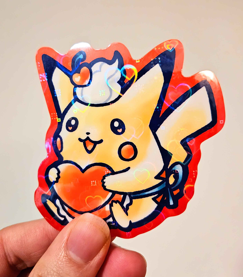 A vinyl sticker featuring Pikachu in an adorable Valentine's Day outfit with a sparkling Red Glitter OR Holographic Hearts finish!