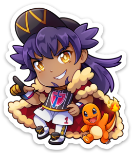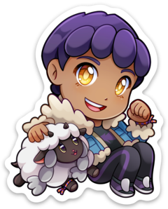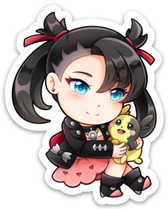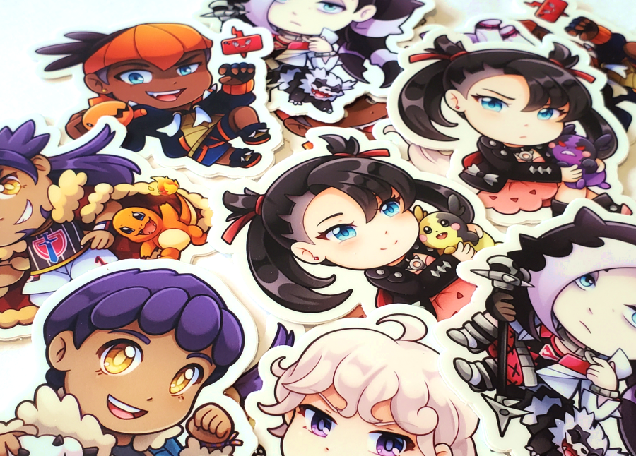 A vinyl sticker set featuring Marnie (smiling and pouting versions) Piers, Hop, Leon, Raihan, & Bede from Sword & Shield and their Pokémon partners!